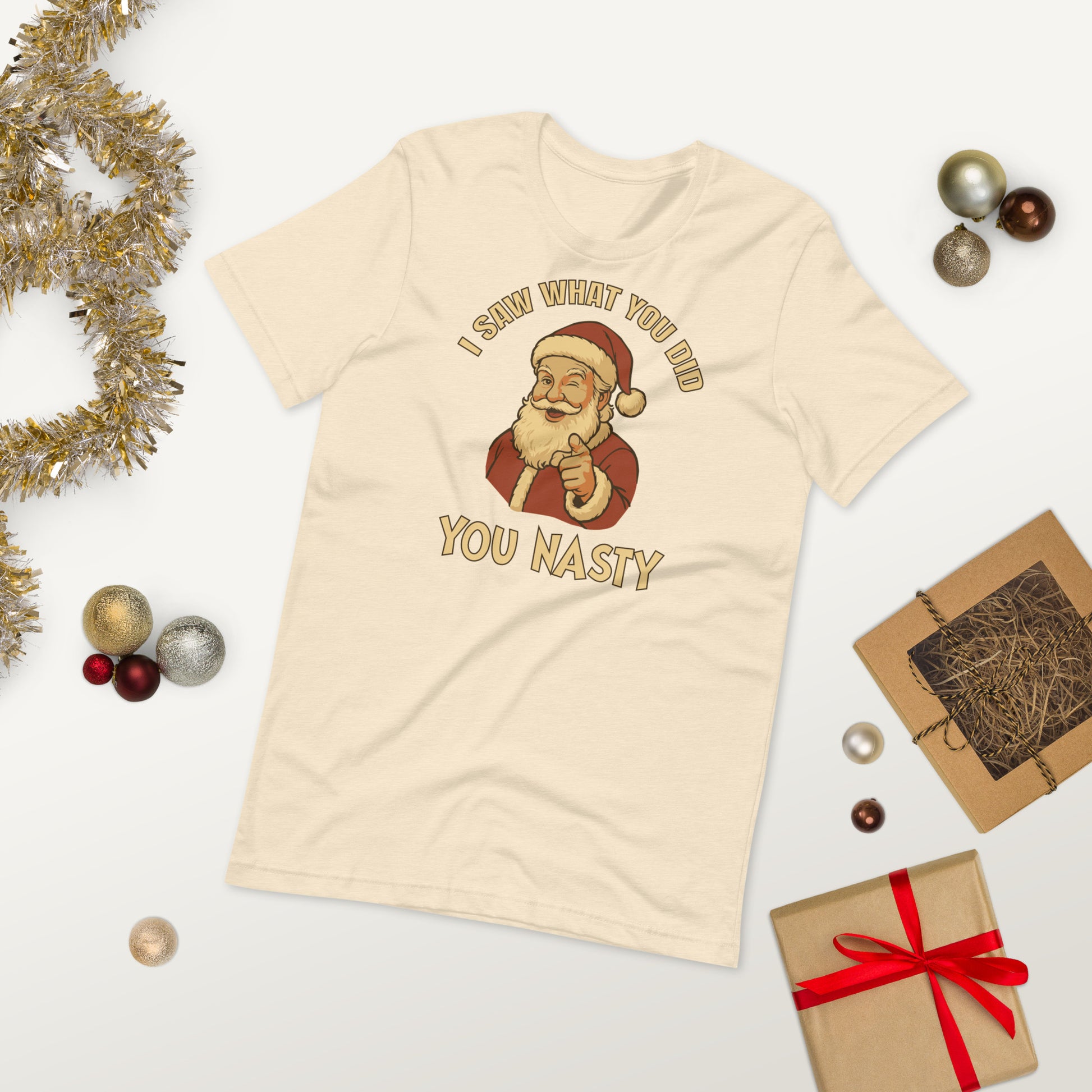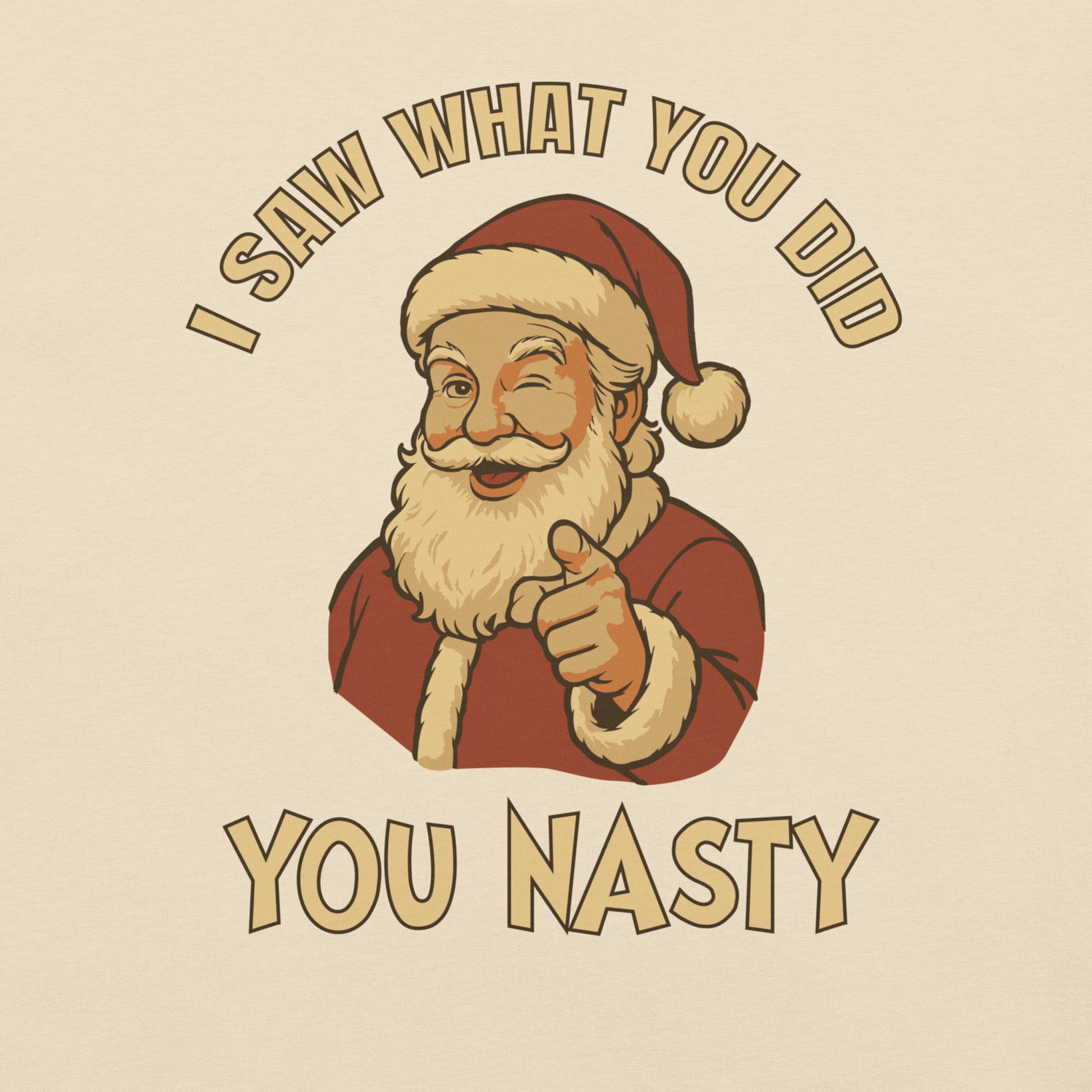 Santa’s got his eye on you—and he’s not afraid to call it out! Our “I Saw What You Did – You Nasty” Shirt brings a cheeky twist to holiday humor, featuring a playful graphic of Santa winking and pointing like he knows all your little secrets. Perfect for anyone who loves to mix festive cheer with a little naughty mischief.